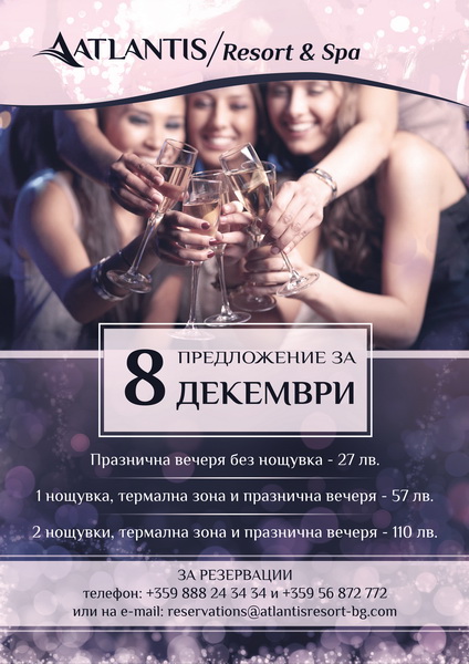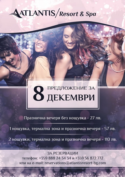 Допълнителна информация:Предложение за 8-ми декември:Празнична вечеря без нощувка - 27 лв. 1 нощувка, термална зона и празнична вечеря - 57 лв. 2 нощувки, термална зона и празнична вечеря - 110 лв. Няма ли да е чудесно да се почувствате специални при наличието на всякакви услуги и удобства на едно място? Просторни хотелски стаи и апартаменти за невероятни преживявания... Разкрасяващи, лечебни и релаксиращи процедури и автентични български ястия... Почивка и развлечения за цялото семейство... Прекрасен плаж с великолепна панорама към Черно море и околните места… Почивката Ви може да започне от Спа Хотел Атлантис! Потопете се в безвремие – на изтънченост и традиции, където цари божествено спокойствие – далеч от оживените бургаски улици. Тук Ви очаква несравним комфорт и безупречно обслужване. Оставете на нас грижата за всички подробности… |