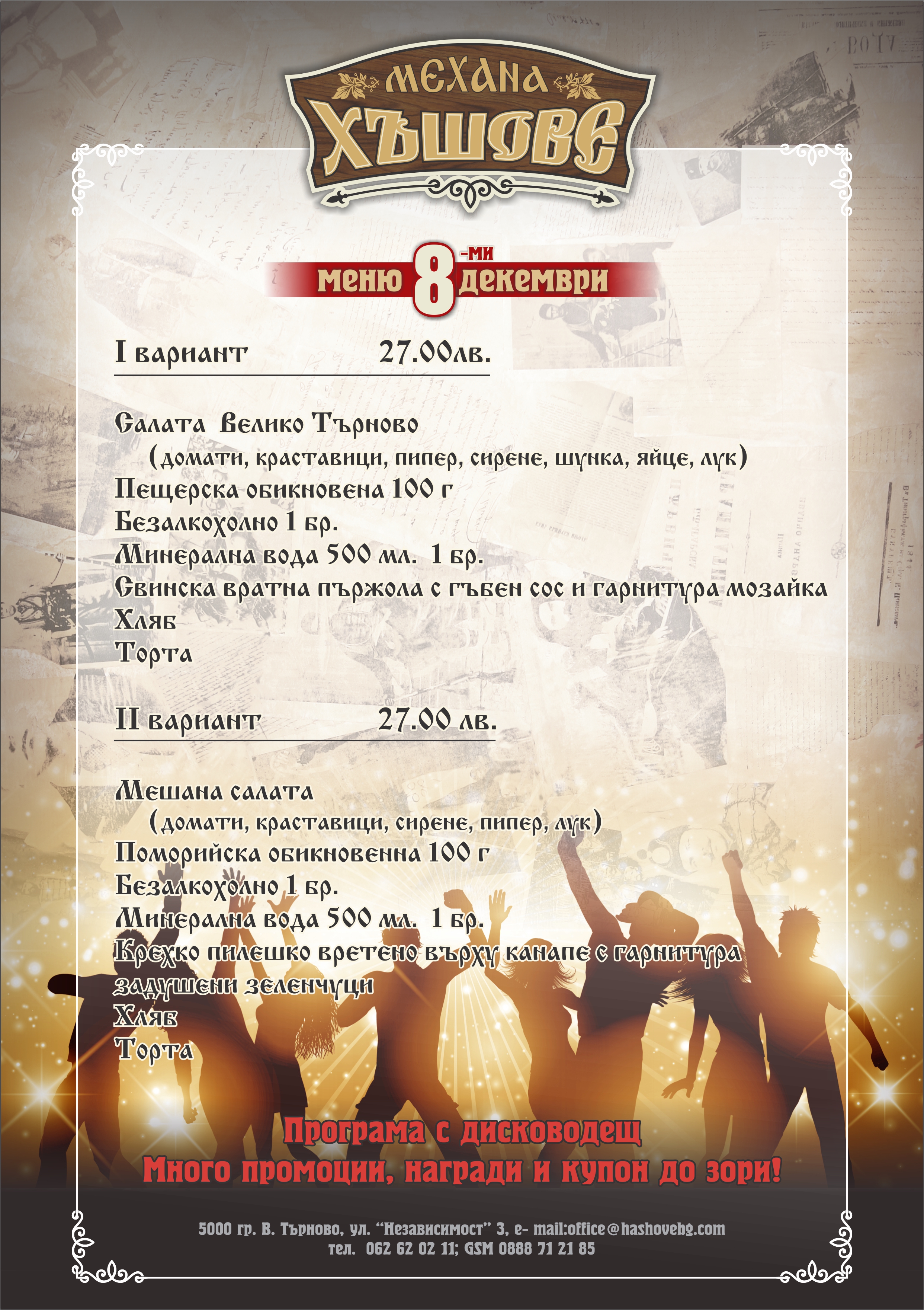 Допълнителна информация:МЕНЮ ЗА 8-ми ДЕКЕМВРИВариант I - 27.00 лв. Салата„ Велико Търново“ /домати, краставици, сирене, пипер, шунка, яйце, лук/ Пещерска обикновена 100 гр Безалкохолно 1бр. Минерална вода 1бр. Свинска вратна пържола с гъбен сос и гарнитура мозайка Хляб Торта Вариант II - 27.00 лв. Мешана салата /домати, краставици, сирене, пипер, лук/ Поморийска гроздова ракия 100 гр. Безалкохолно 1бр. Минерална вода 500 мл. 1 бр. Крехко пилешко вретено върху канапе с гарнитура задушени зеленчуци Хляб Торта Програма с дисководещ! Много промоции, награди и купон до зори! |